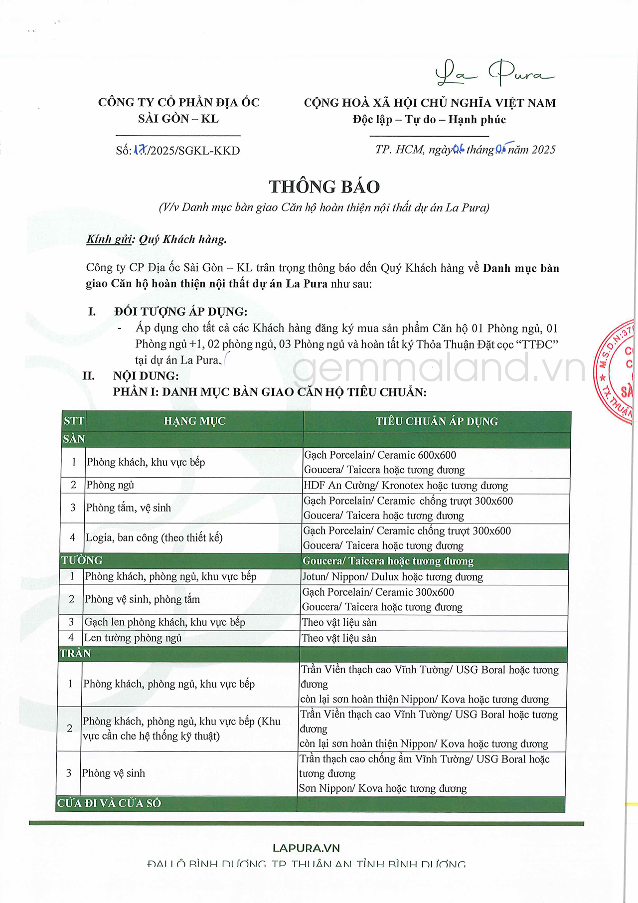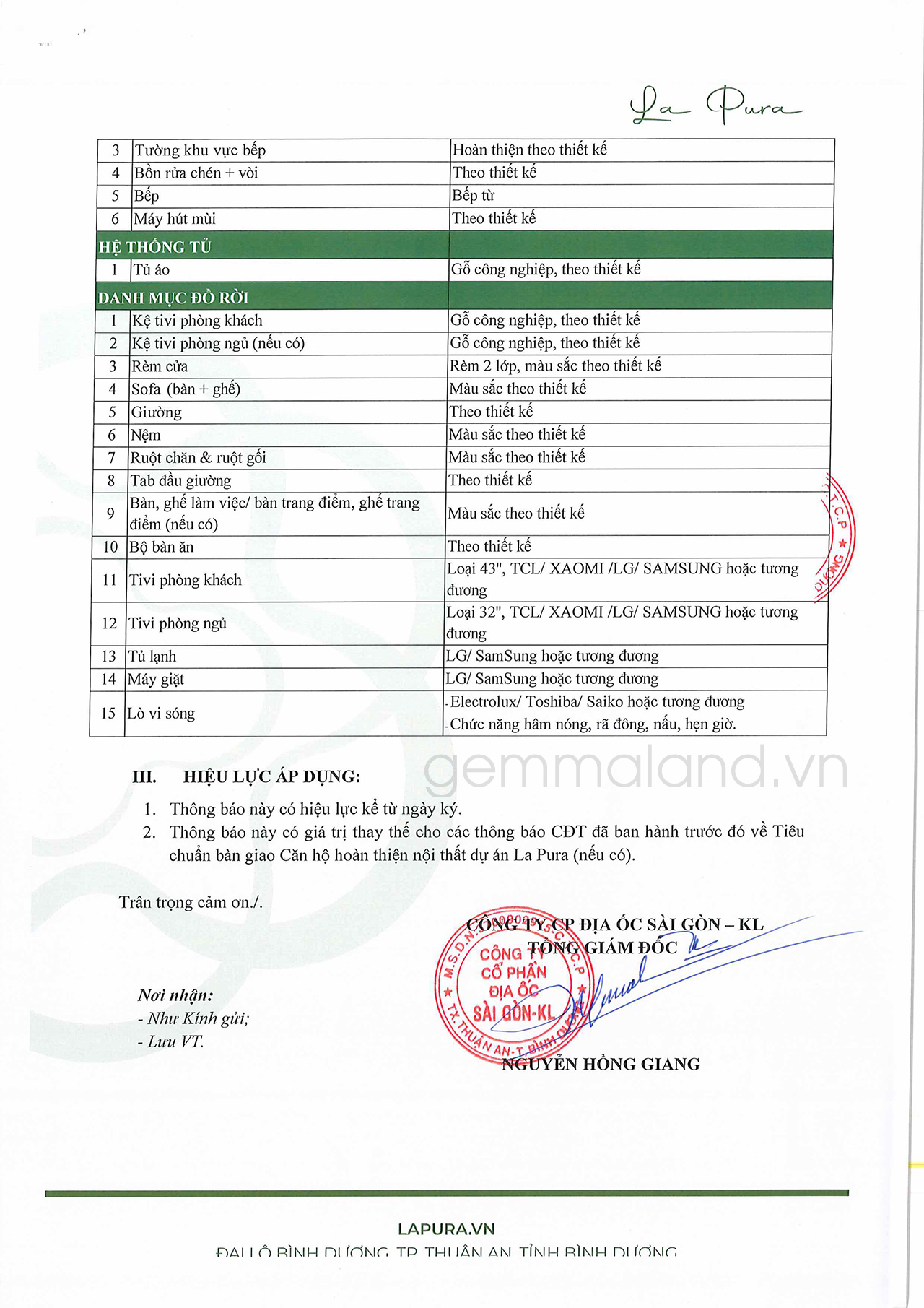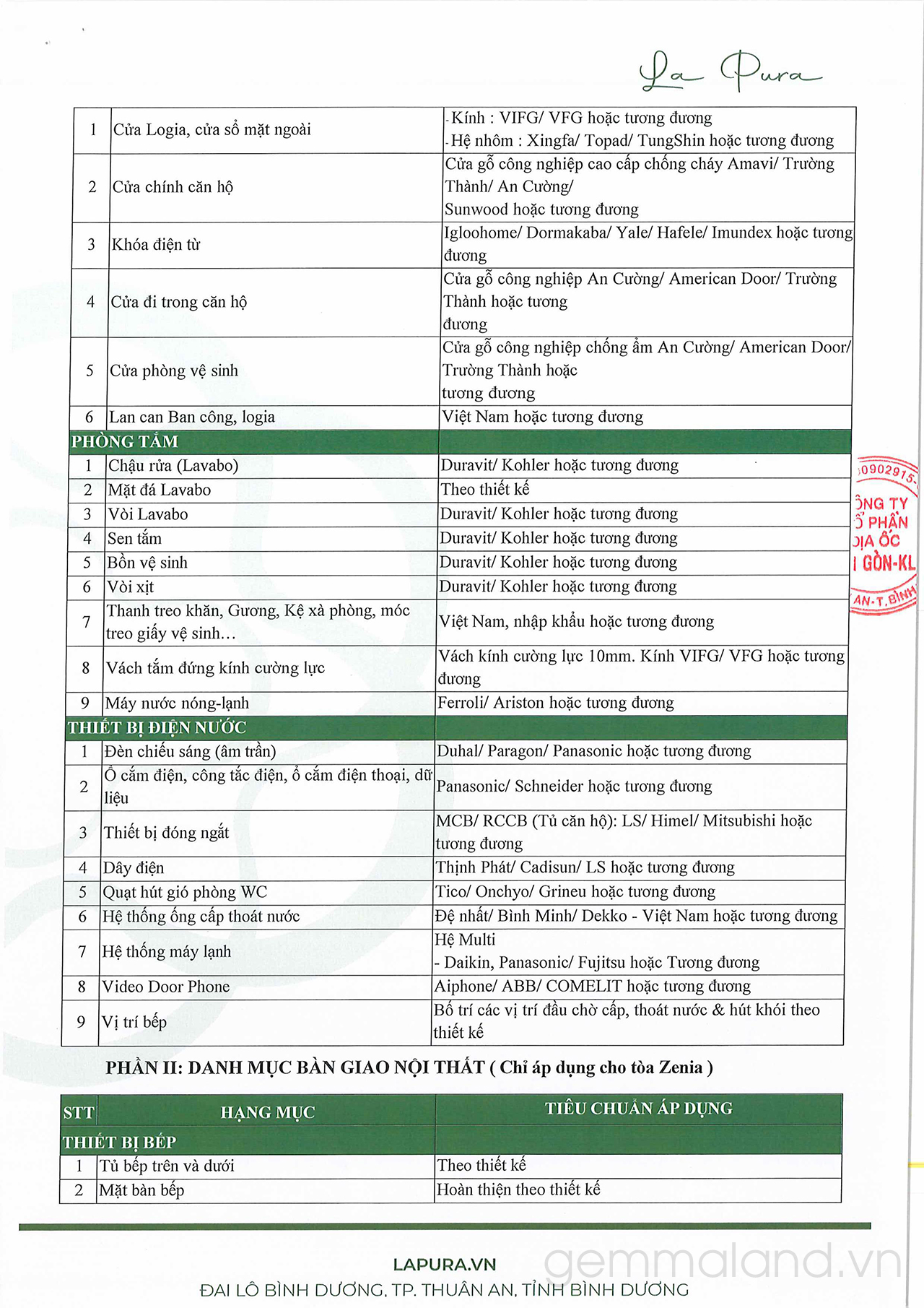 Danh mục bàn giao căn hộ La Pura Bình Dương: